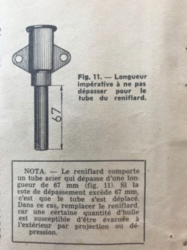 Segona imatge (dibuix) , l’esquema original del manual de taller que indica la longitud exacta (67 mm) que ha de sobresortir el tub, imprescindible per evitar tant l’aspiració d’aire Venturi com la projecció d’oli a l’exterior.