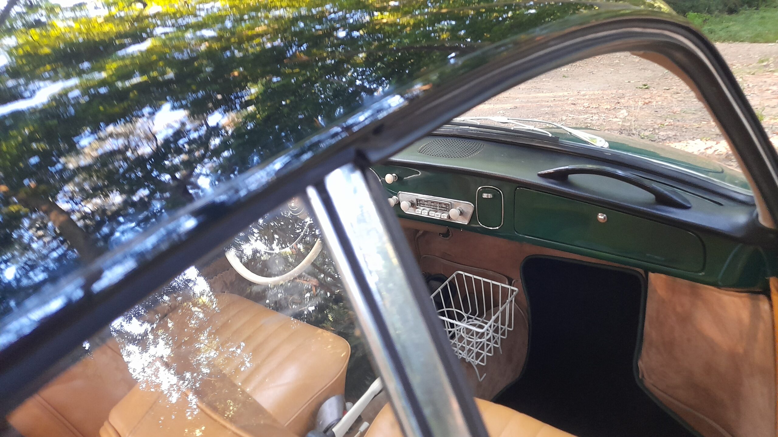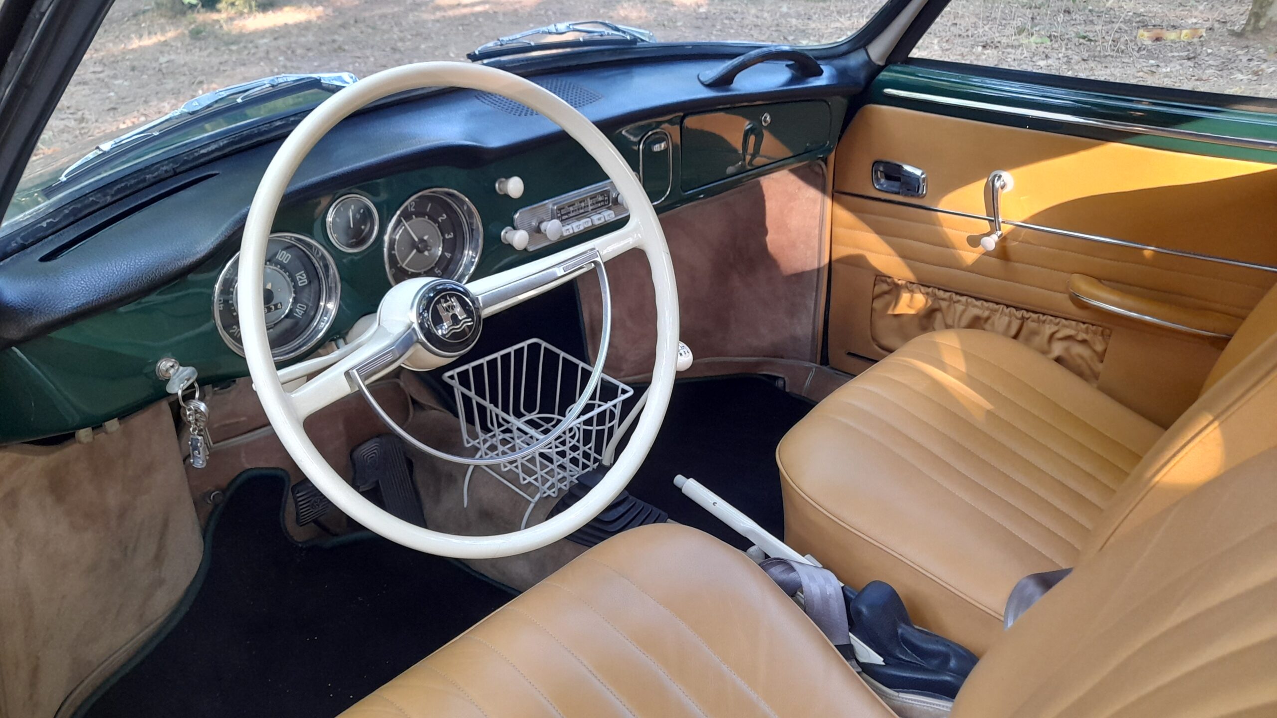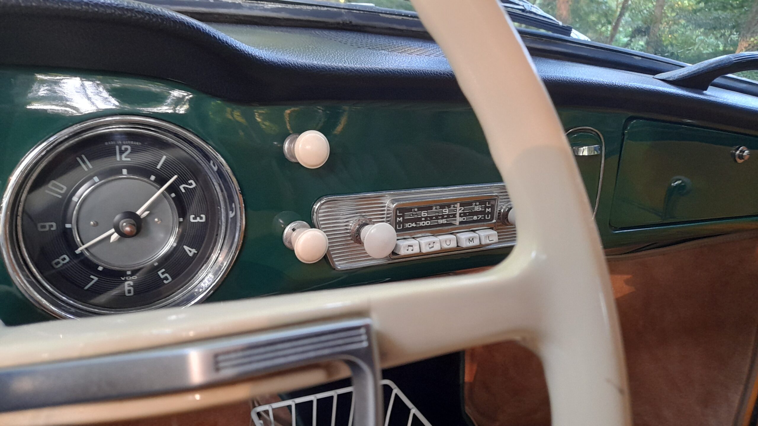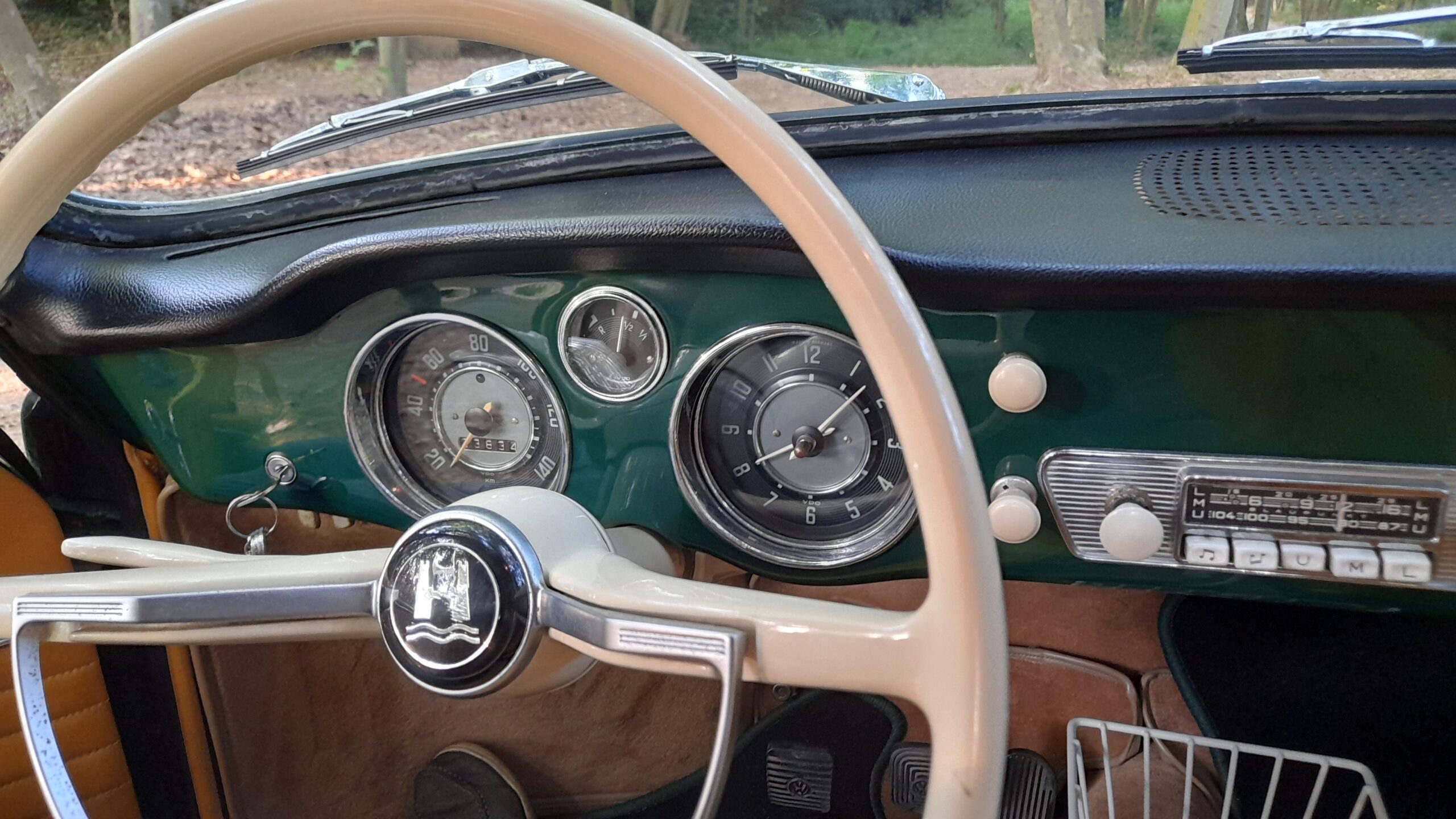 Le Karmann a fait l’objet d’une restauration complète de la carrosserie, du châssis et de la sellerie et, dans un deuxième temps, du moteur. L’intérieur a été refait en camel, une teinte qui, même si elle n’est pas exactement celle d’origine, s’harmonise parfaitement avec le vert foncé de la carrosserie et le noir du toit, ce qui lui confère une impression de chaleur et d’élégance sans rompre la cohérence esthétique des voitures VW à refroidissement par air des années 1960.