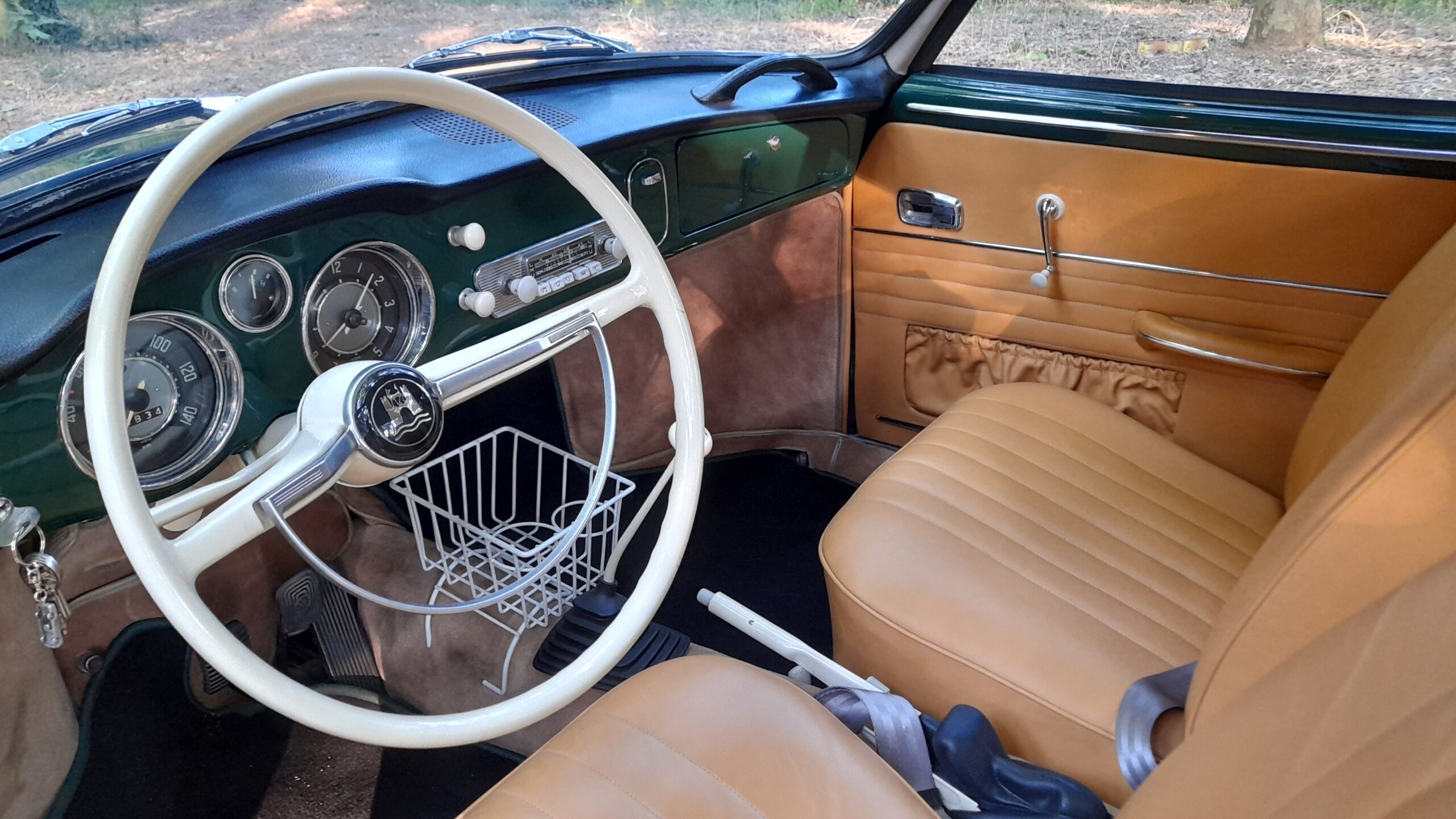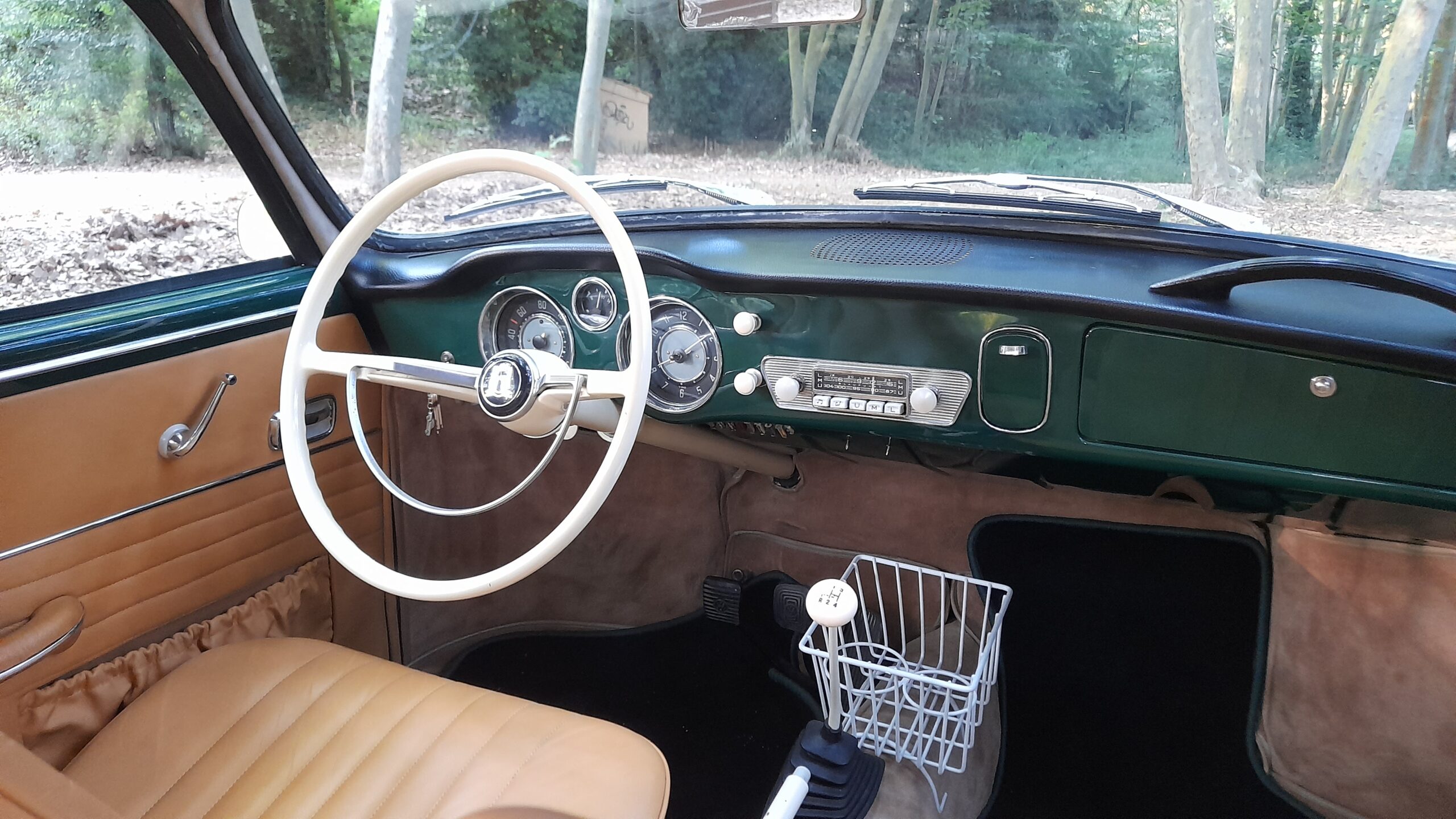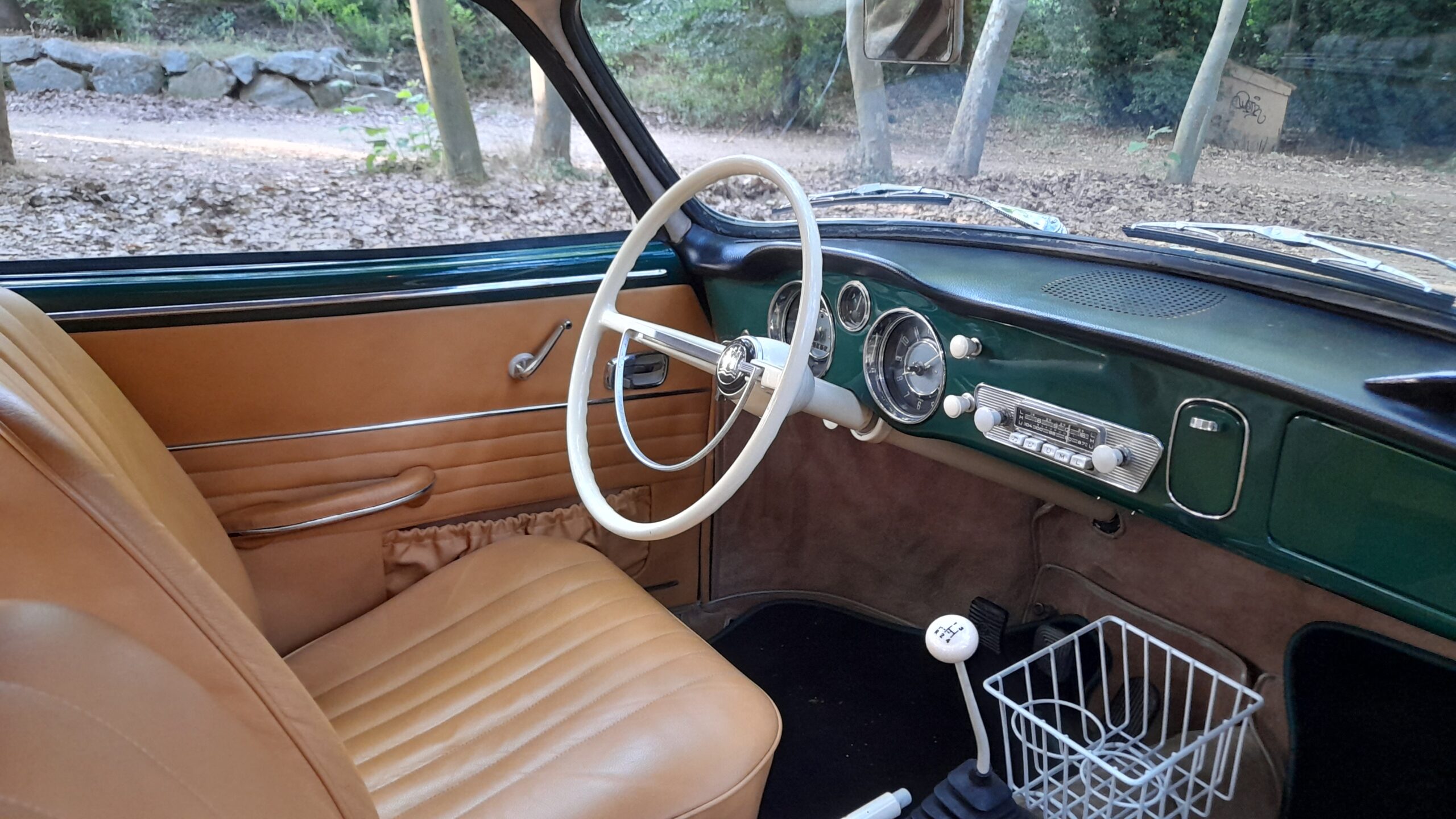 Le Karmann a fait l’objet d’une restauration complète de la carrosserie, du châssis et de la sellerie et, dans un deuxième temps, du moteur. L’intérieur a été refait en camel, une teinte qui, même si elle n’est pas exactement celle d’origine, s’harmonise parfaitement avec le vert foncé de la carrosserie et le noir du toit, ce qui lui confère une impression de chaleur et d’élégance sans rompre la cohérence esthétique des voitures VW à refroidissement par air des années 1960.