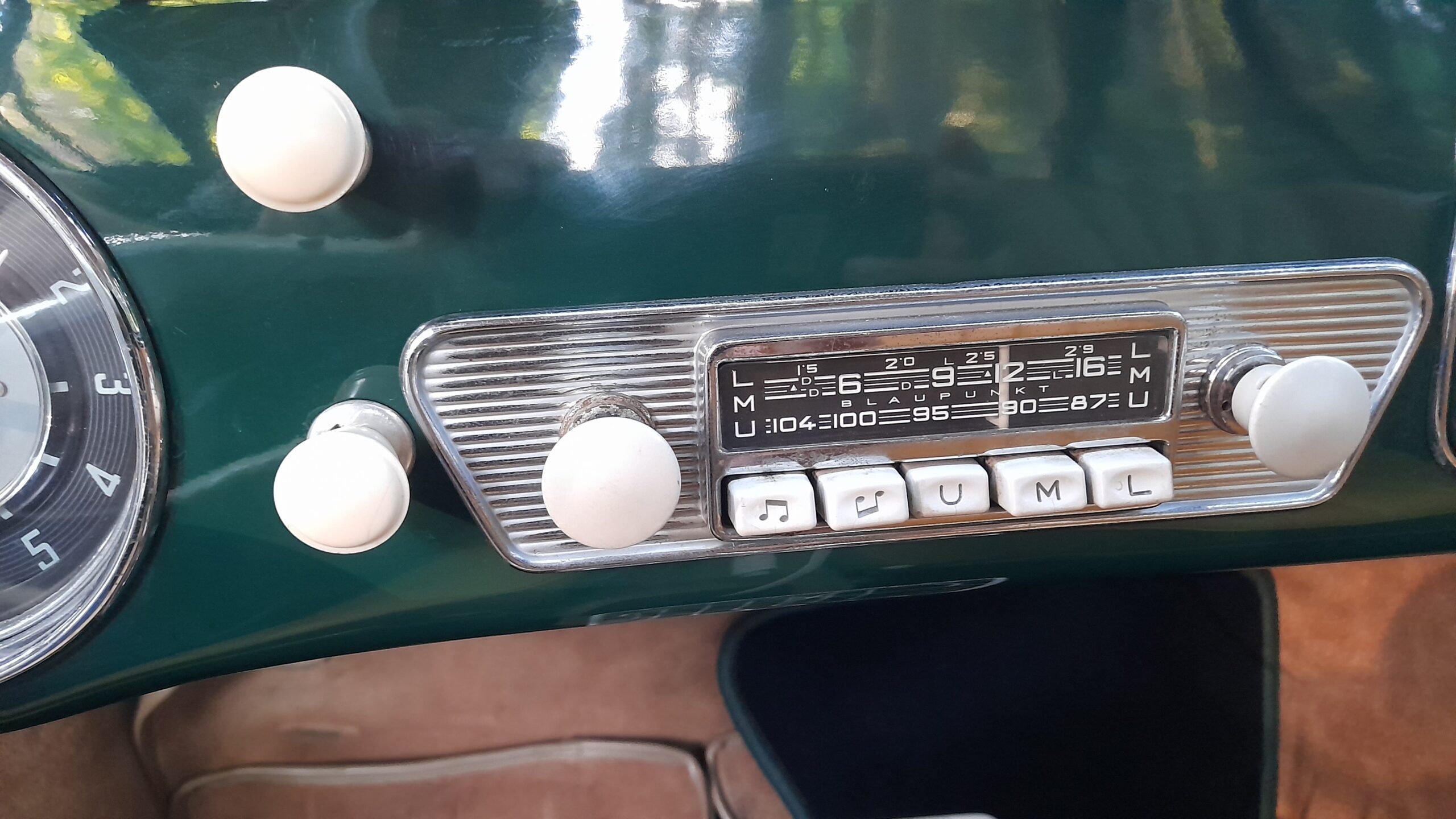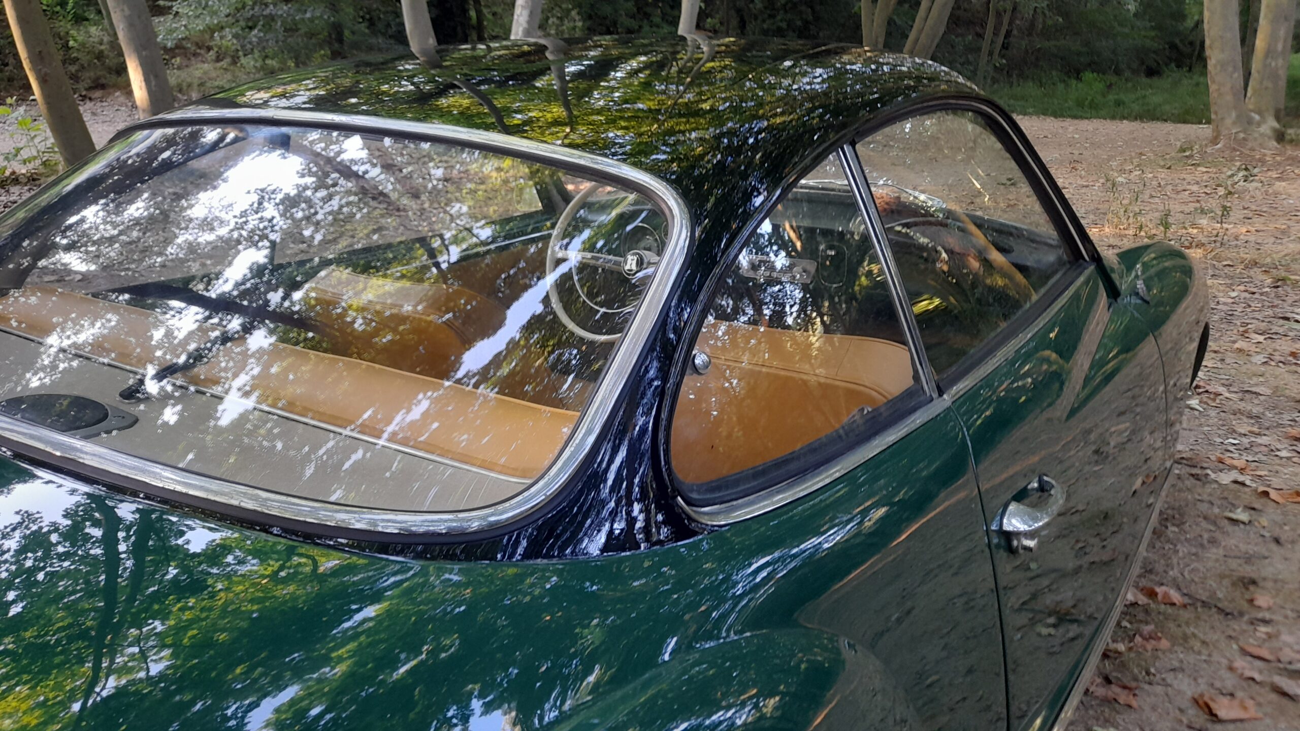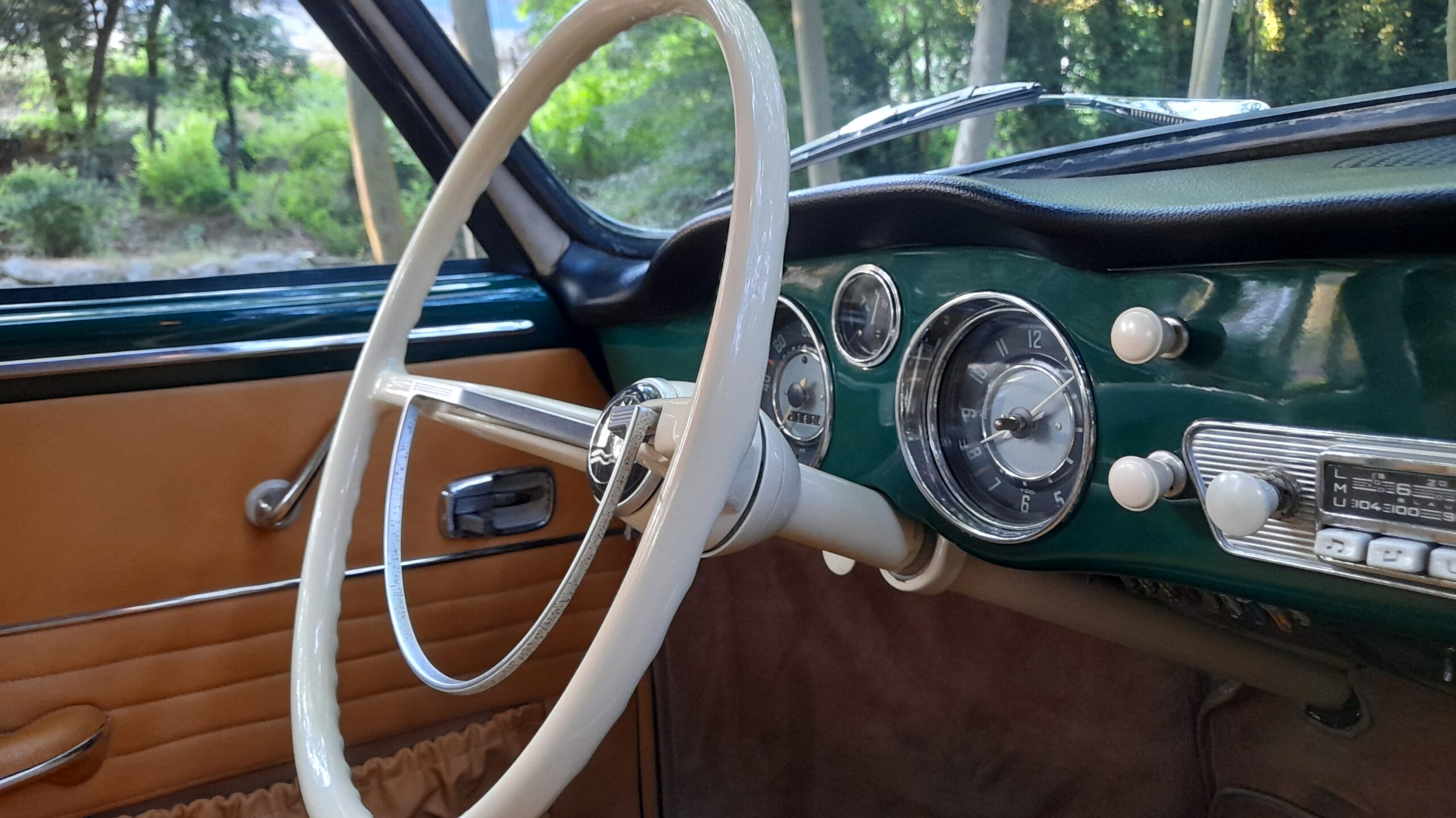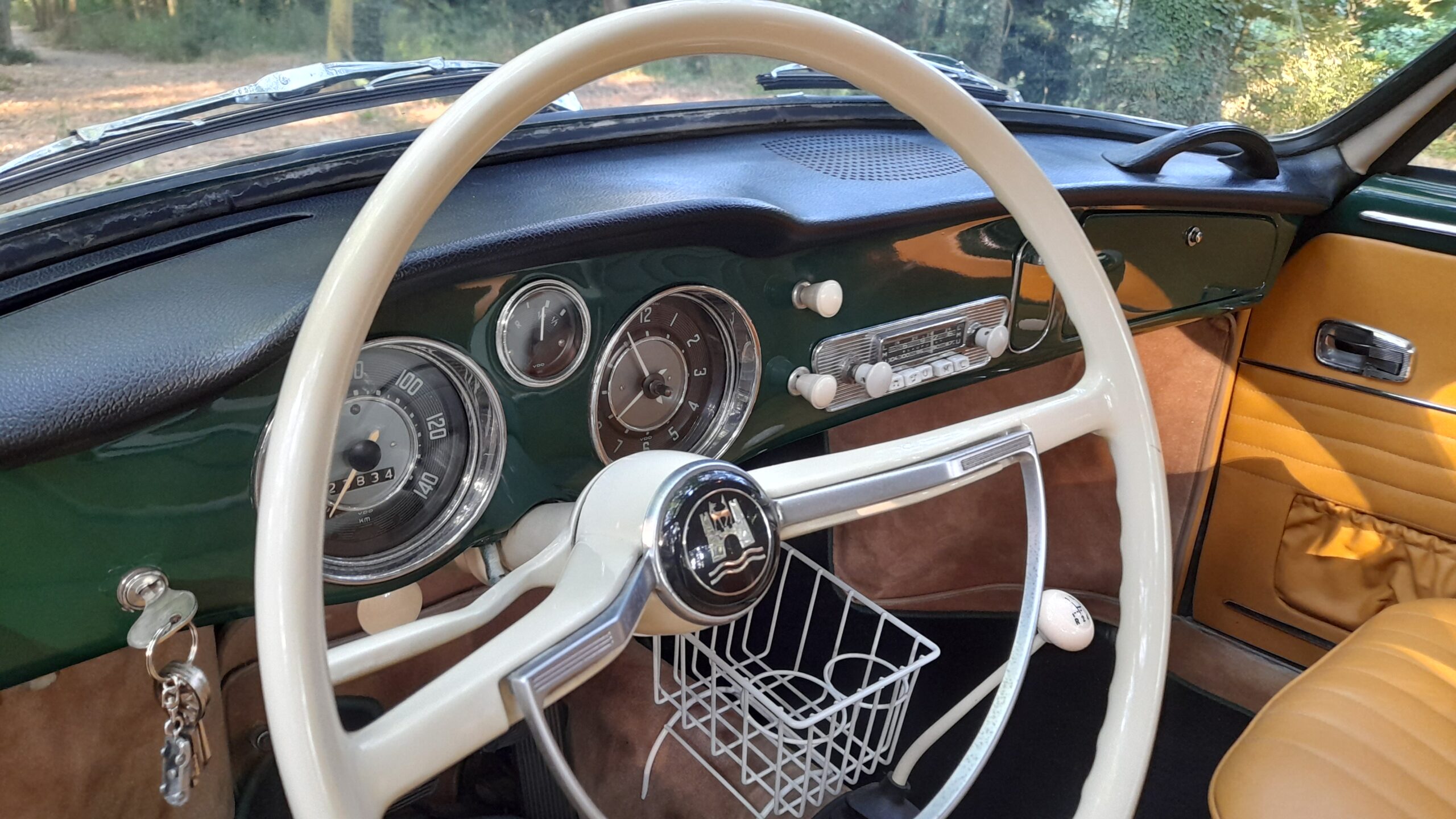 Le Karmann a fait l’objet d’une restauration complète de la carrosserie, du châssis et de la sellerie et, dans un deuxième temps, du moteur. L’intérieur a été refait en camel, une teinte qui, même si elle n’est pas exactement celle d’origine, s’harmonise parfaitement avec le vert foncé de la carrosserie et le noir du toit, ce qui lui confère une impression de chaleur et d’élégance sans rompre la cohérence esthétique des voitures VW à refroidissement par air des années 1960.