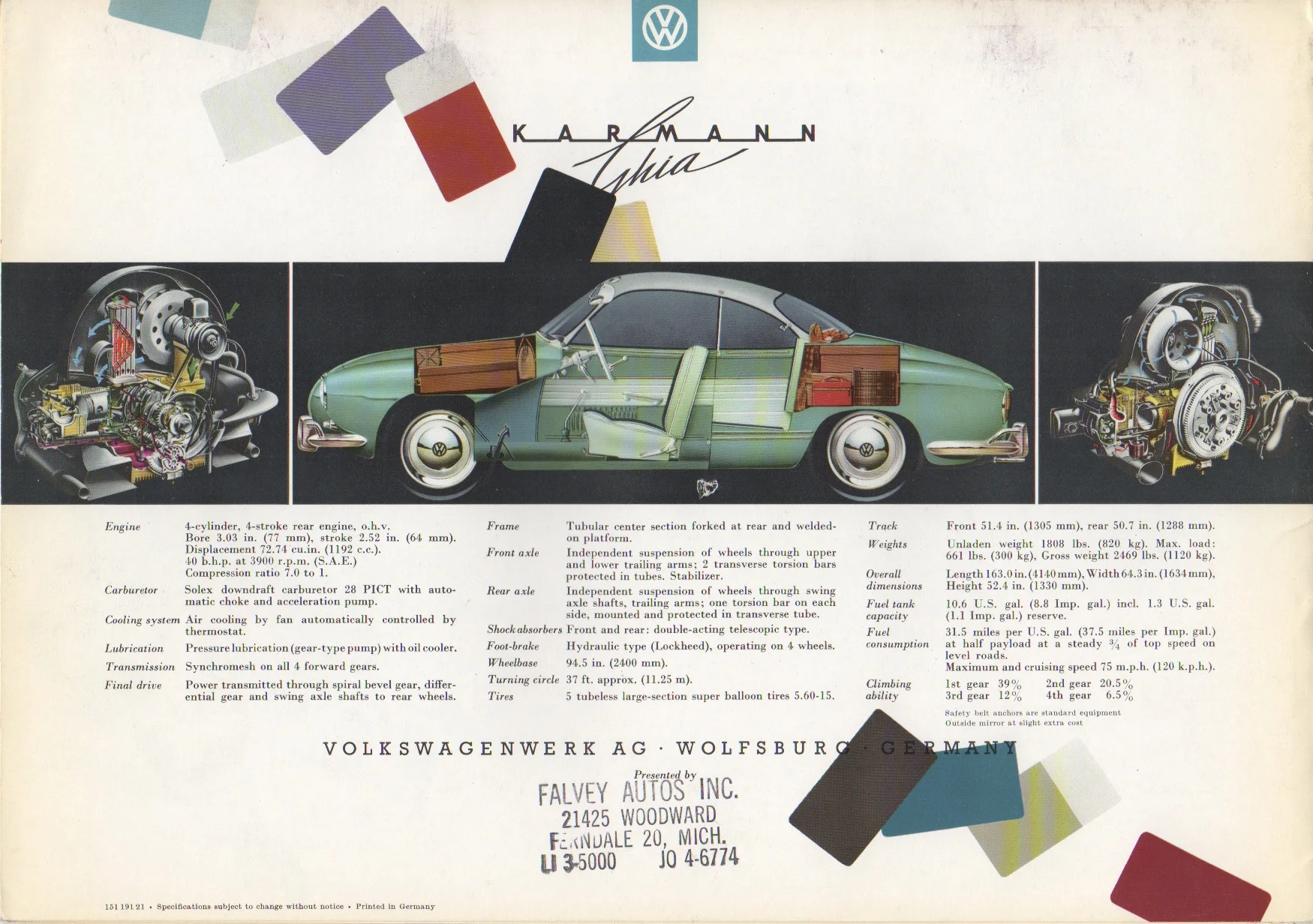 - Raretés de production : Outre la très faible production du cabriolet brésilien (177 unités), mentionnée plus haut, il existe d’autres détails curieux. Toutes les Karmann Ghia ont été officiellement produites dans deux usines: Karmann à Osnabrück (Allemagne) et Volkswagen do Brasil à São Bernardo do Campo. La Ghia n’a jamais été produite au Mexique, bien que le modèle ait été populaire auprès des importateurs privés de ce pays.